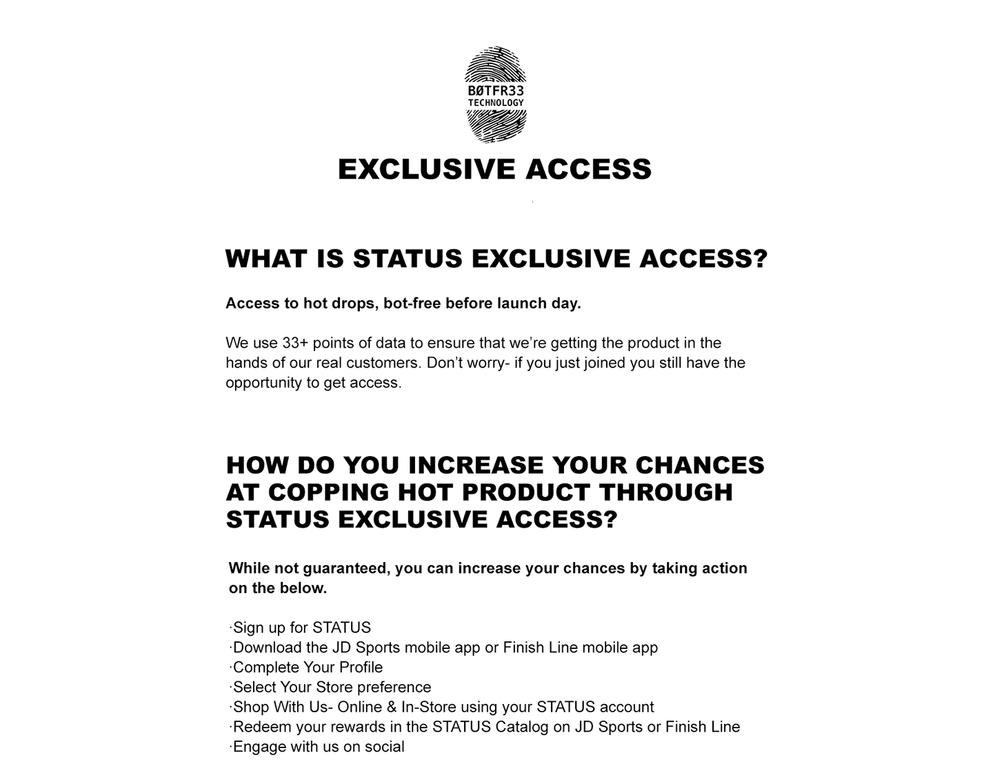 STATUS Exclusive Access is selective, available only to select STATUS members who are given the exclusive chance to reserve shoes for purchase before they’re released. STATUS Exclusive Access is powered by ://B0TFR33 technology. We use 33+ points of data to identify our most engaged STATUS members.